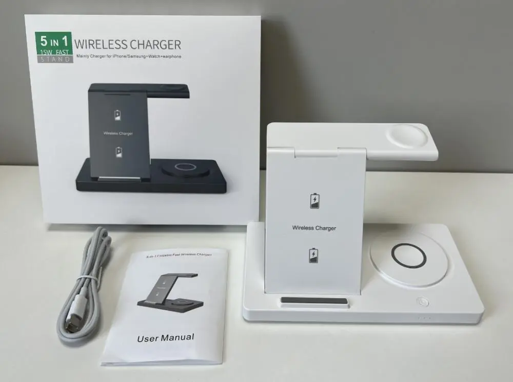 Potência de saída: Posição do celular: 15W/10W/7,5W/5W; Posição inferior: 5W; Posição do relógio: 3W; Compatível com Samsung e Apple Watch; Luz noturna: 2W;